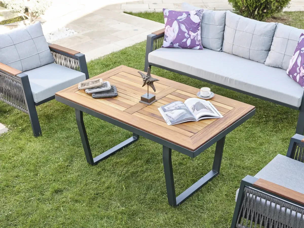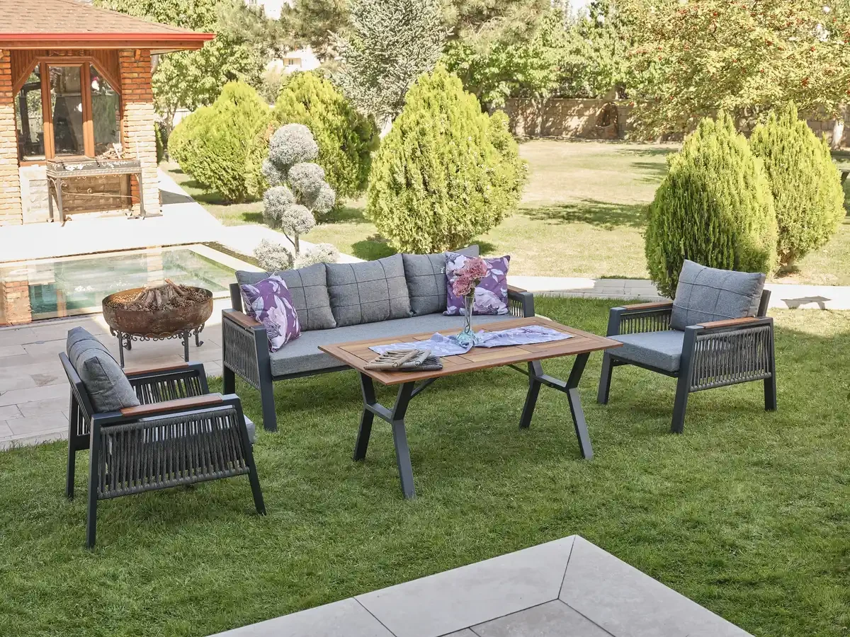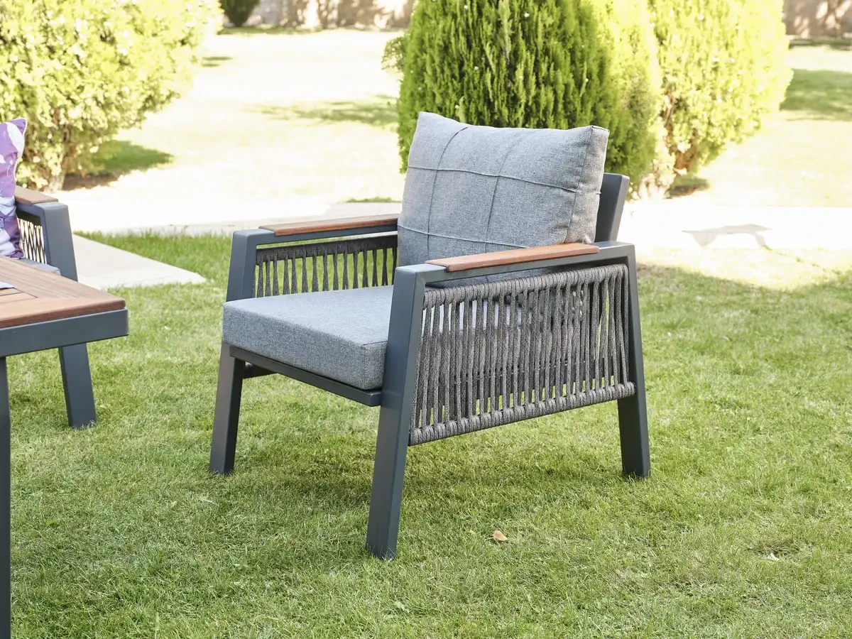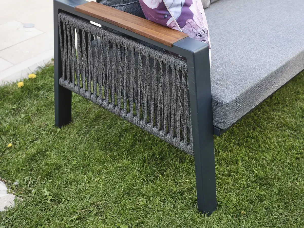 The product is manufactured from aluminum and coated with electrostatic powder paint. Iroko wood is used in the wooden sections. The cushions feature 32 DNS high-density foam, and the fabrics are water-repellent and stain-resistant. The ropes are Luxio-Cord, specially produced abroad for Terazzi. They are washable and resistant to water and UV exposure.
