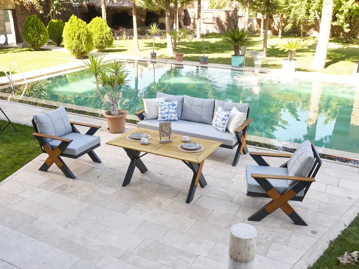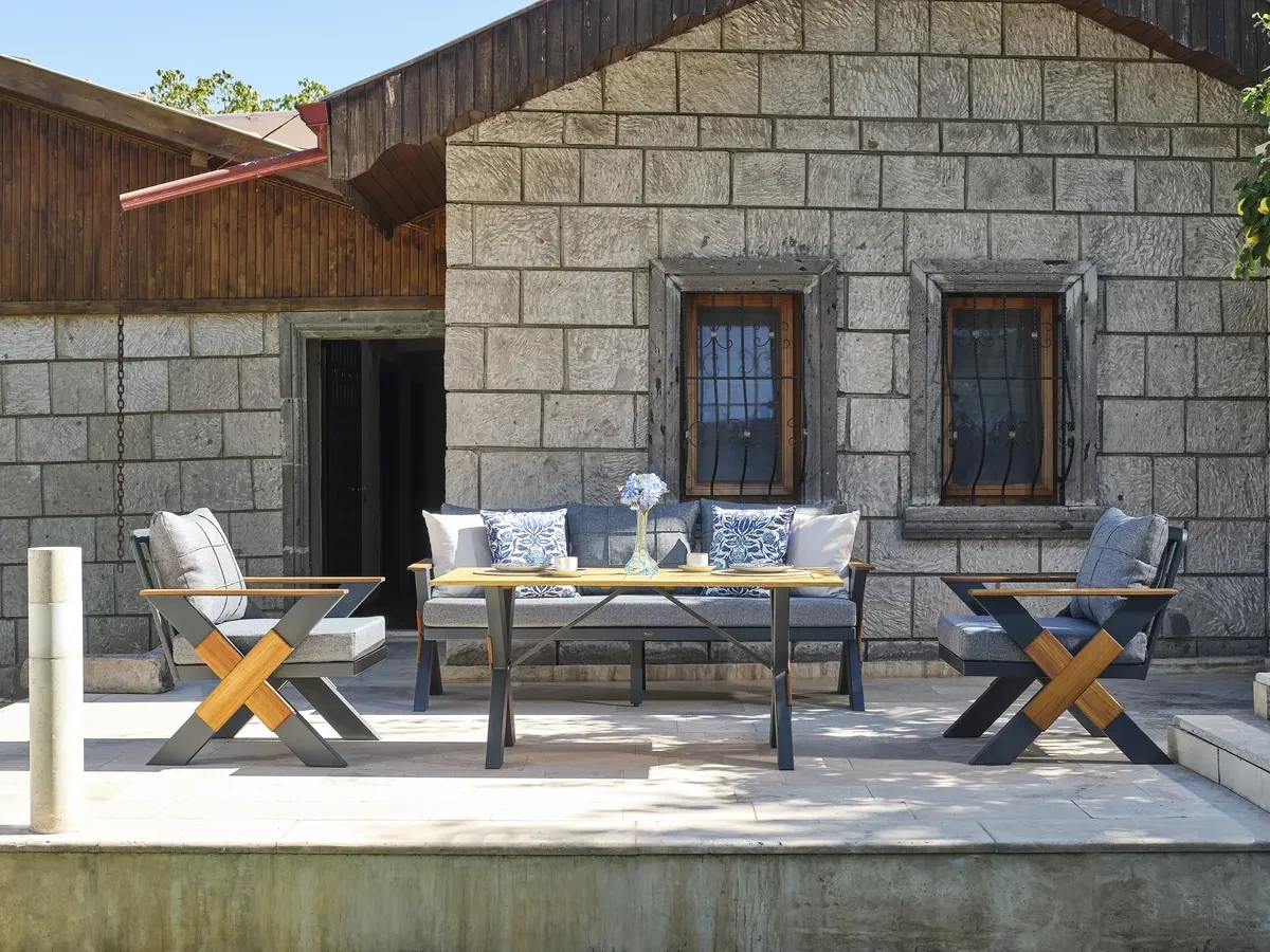 The Lotus seating group, which has a different design, continues to appeal to the eye with the combination of aluminum and wood. The Lotus seating group, which will add to your comfort with its comfortable seating, stainless structure and water-repellent feature of the cushion fabrics, is offered to you.