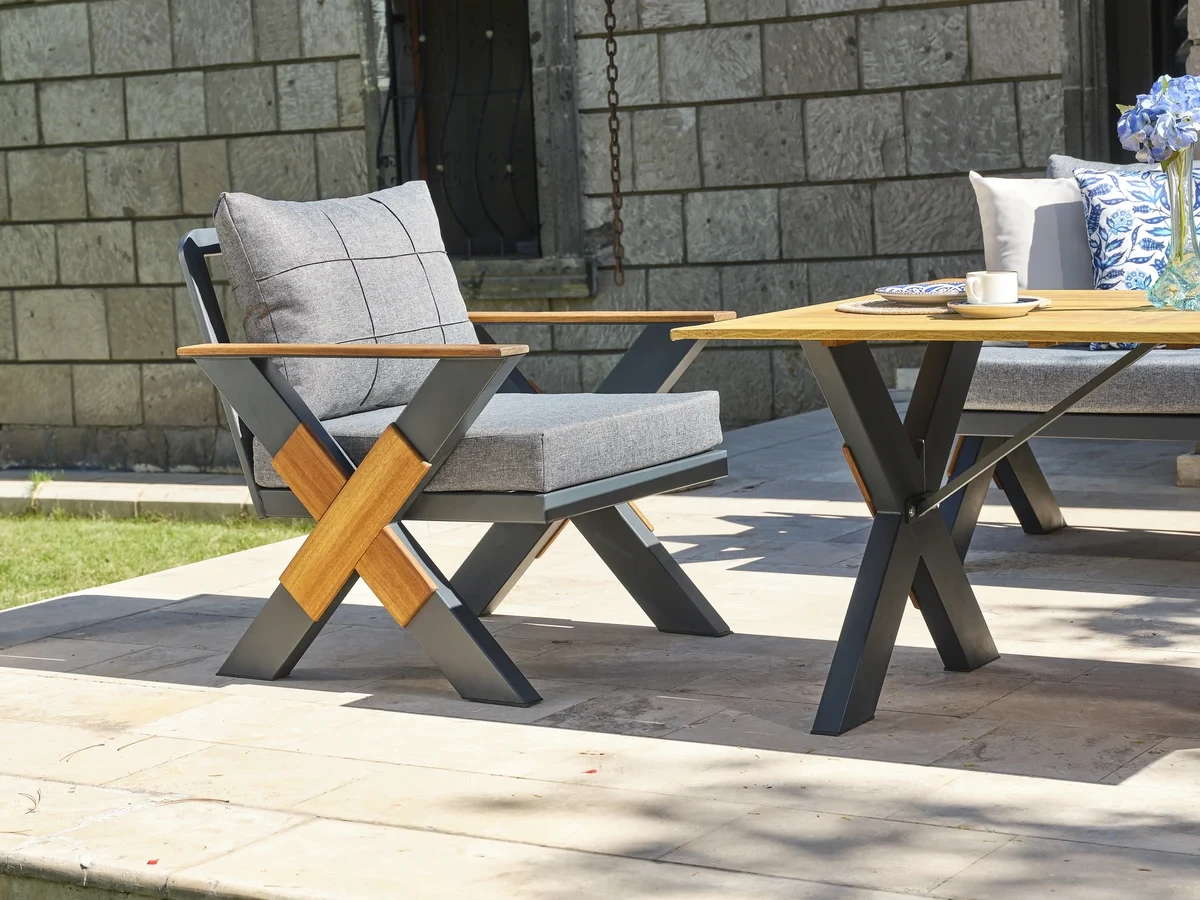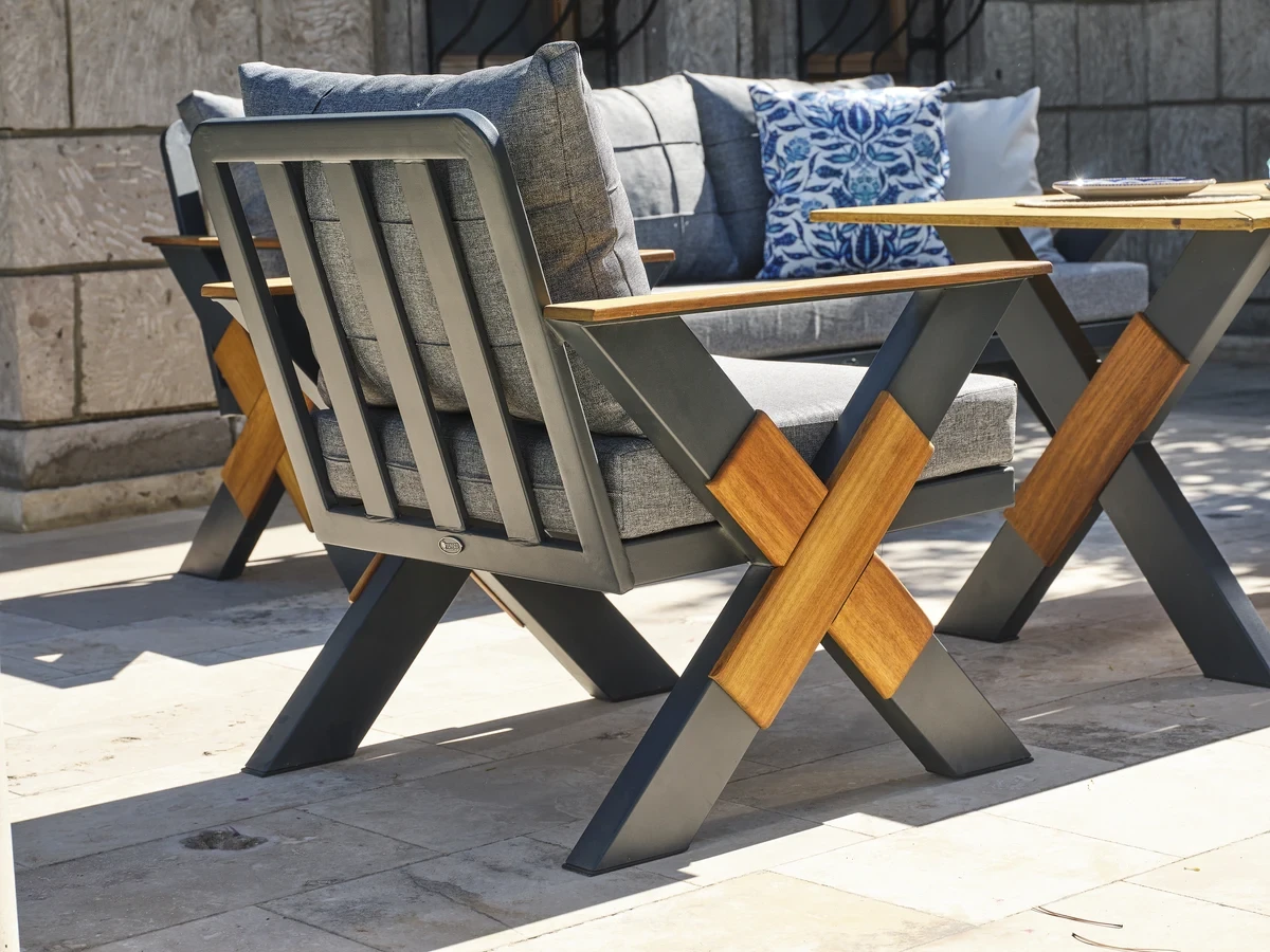 The product is manufactured from aluminum and coated with electrostatic powder paint. Iroko wood is used in the wooden sections. The cushions feature 32 DNS high-density foam, and the fabrics are water-repellent and stain-resistant.