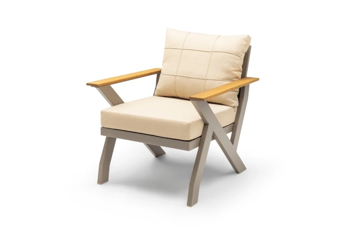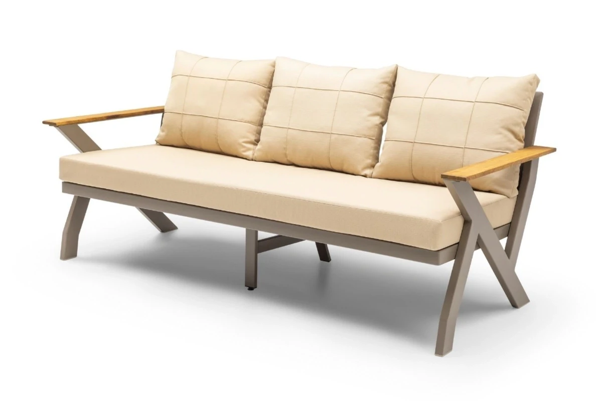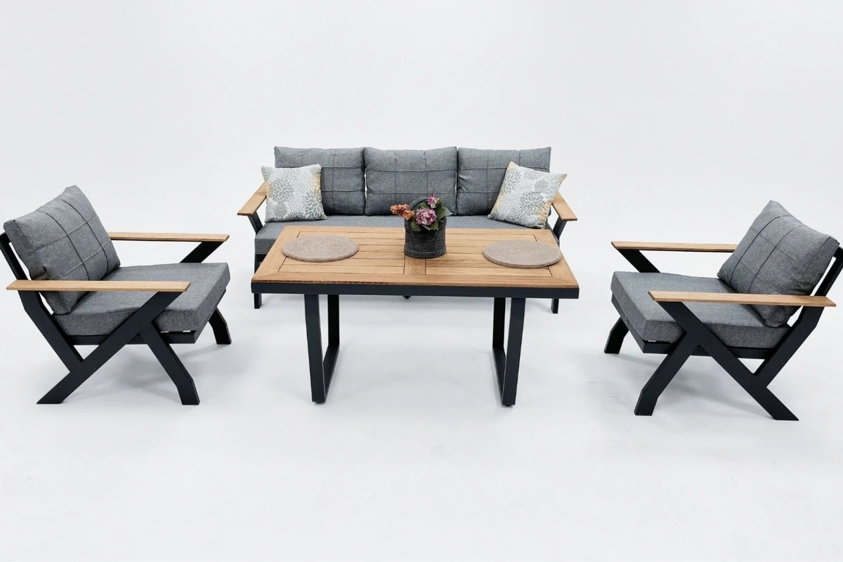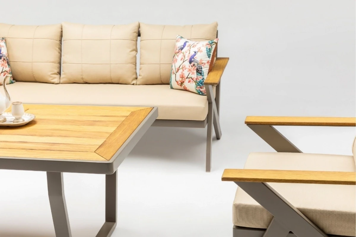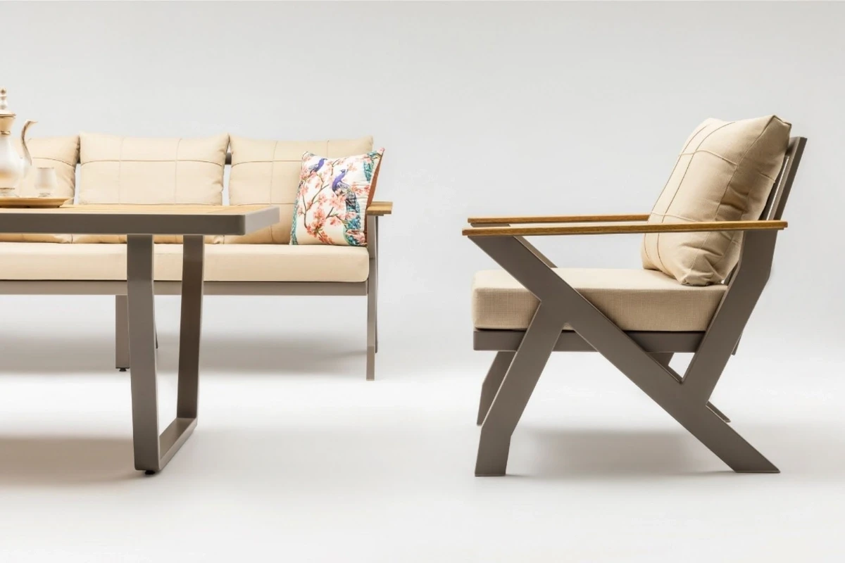 The product is manufactured from aluminum and coated with electrostatic powder paint. Iroko wood is used in the wooden sections. The cushions feature 32 DNS high-density foam, and the fabrics are water-repellent and stain-resistant.