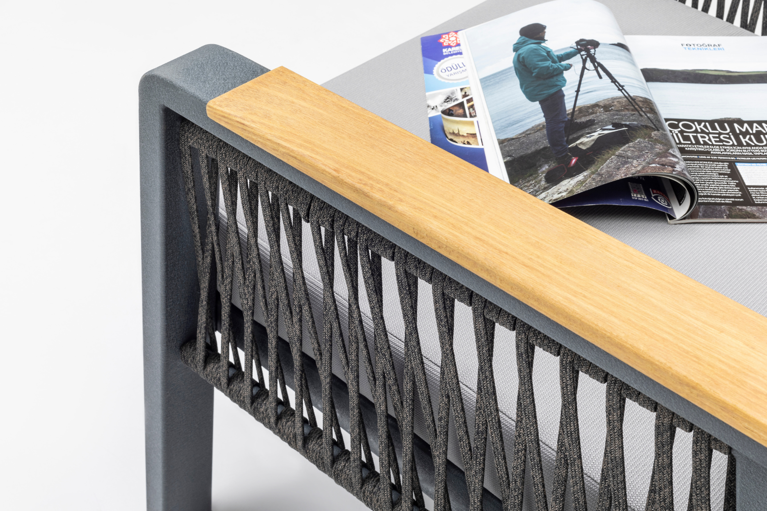 The product is produced from aluminum and painted with electrostatic powder paint. Iroko tree is used in the wooden parts. The cushions used in the product have a density of 32 DNS, and the cushion fabrics are water repellent and stain resistant. The threads in the product are Luxio-Cord threads imported from abroad and produced specifically for Terazzi. The threads are resistant to water and UV rays and they are washable.