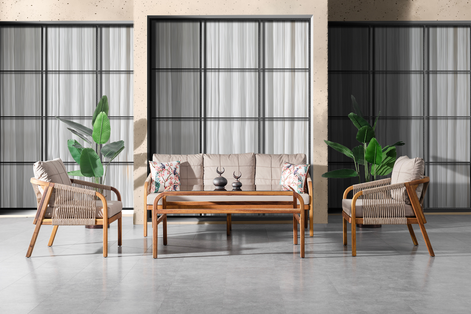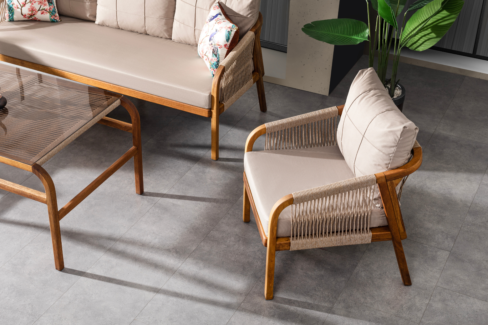 The product is produced from iroko tree. The cushions used in the product have a density of 32 DNS, and the cushion fabrics are water repellent and stain resistant. The threads in the product are Luxio-Cord threads imported from abroad and produced specifically for Terazzi. The threads are resistant to water and UV rays and are washable.