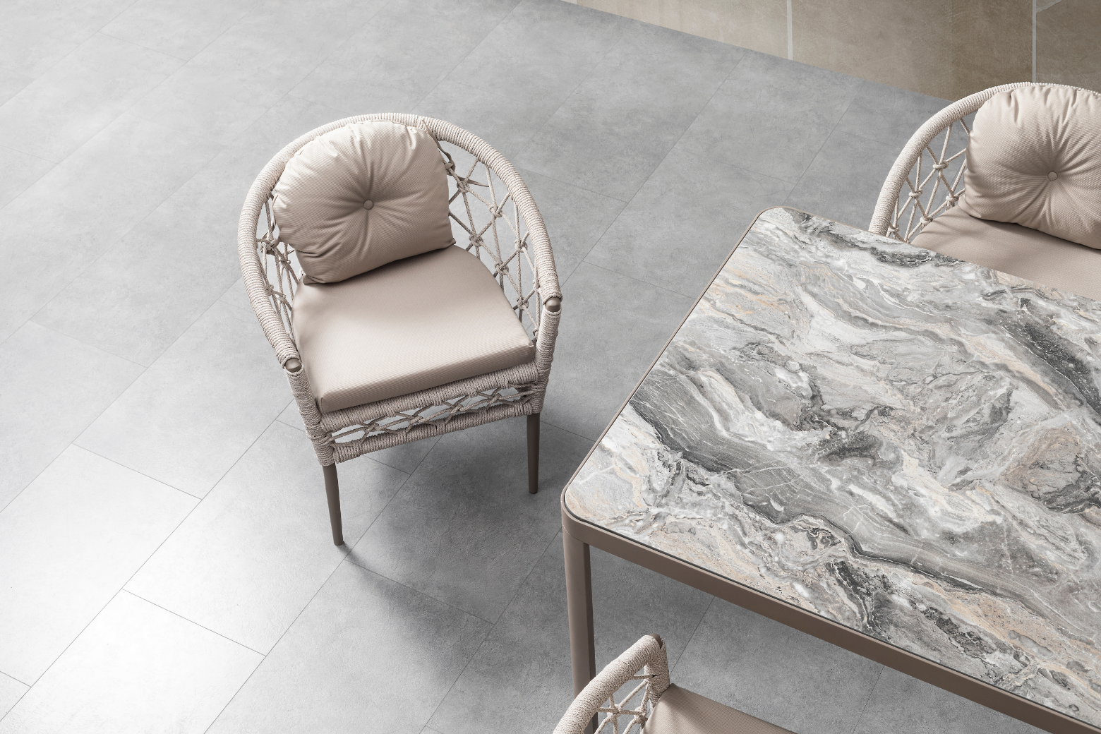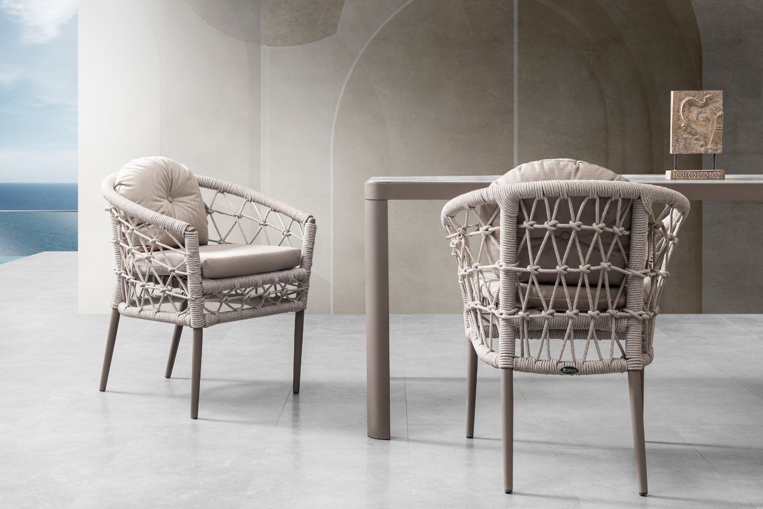The product is produced from aluminum and painted with electrostatic powder paint. Iroko tree is used in the wooden parts. The cushions used in the product have a density of 32 DNS, and the cushion fabrics are water repellent and stain resistant. The threads in the product are Luxio-Cord threads imported from abroad and produced specifically for Terazzi. The threads are resistant to water and UV rays and they are washable.