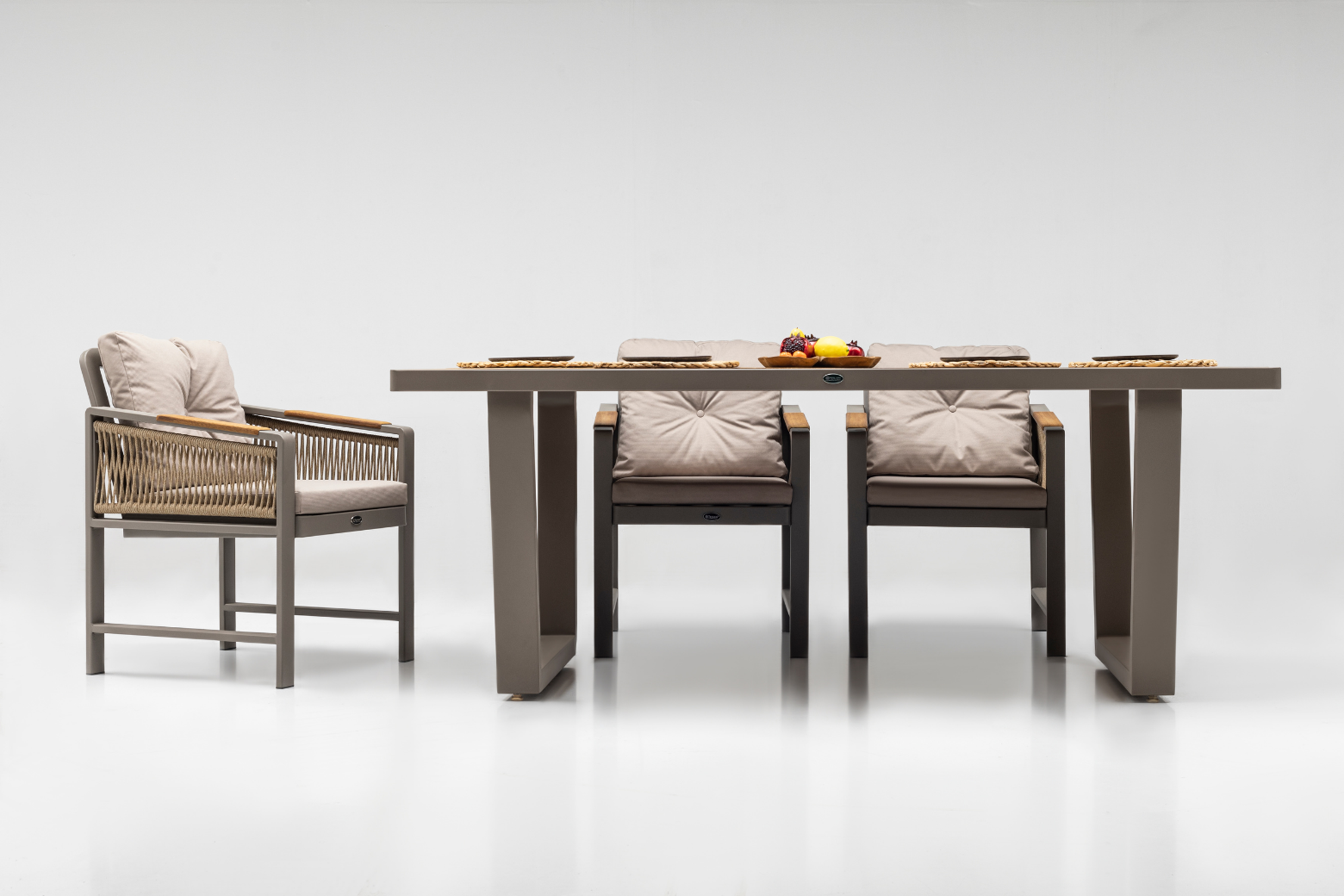 Mykonos Plus table set consists of a 100x200 table and 6 chairs with comfortable seating. It can be used in all seasons with its structure suitable for outdoor weather conditions.