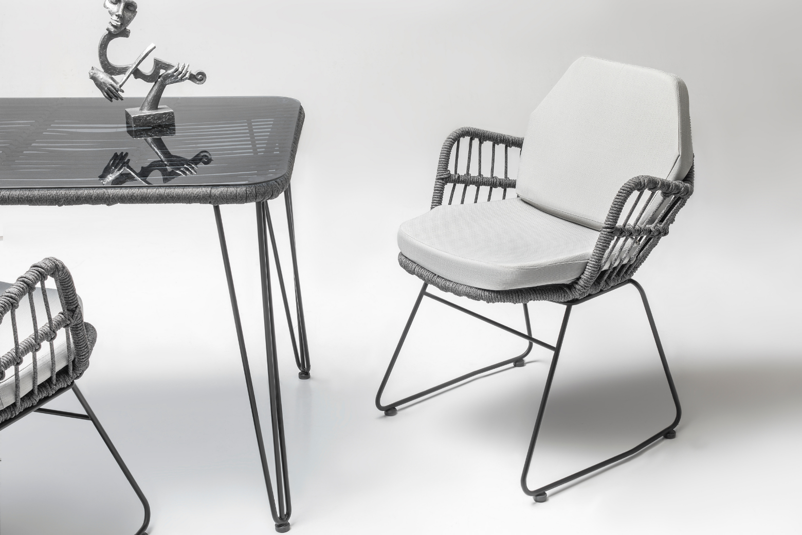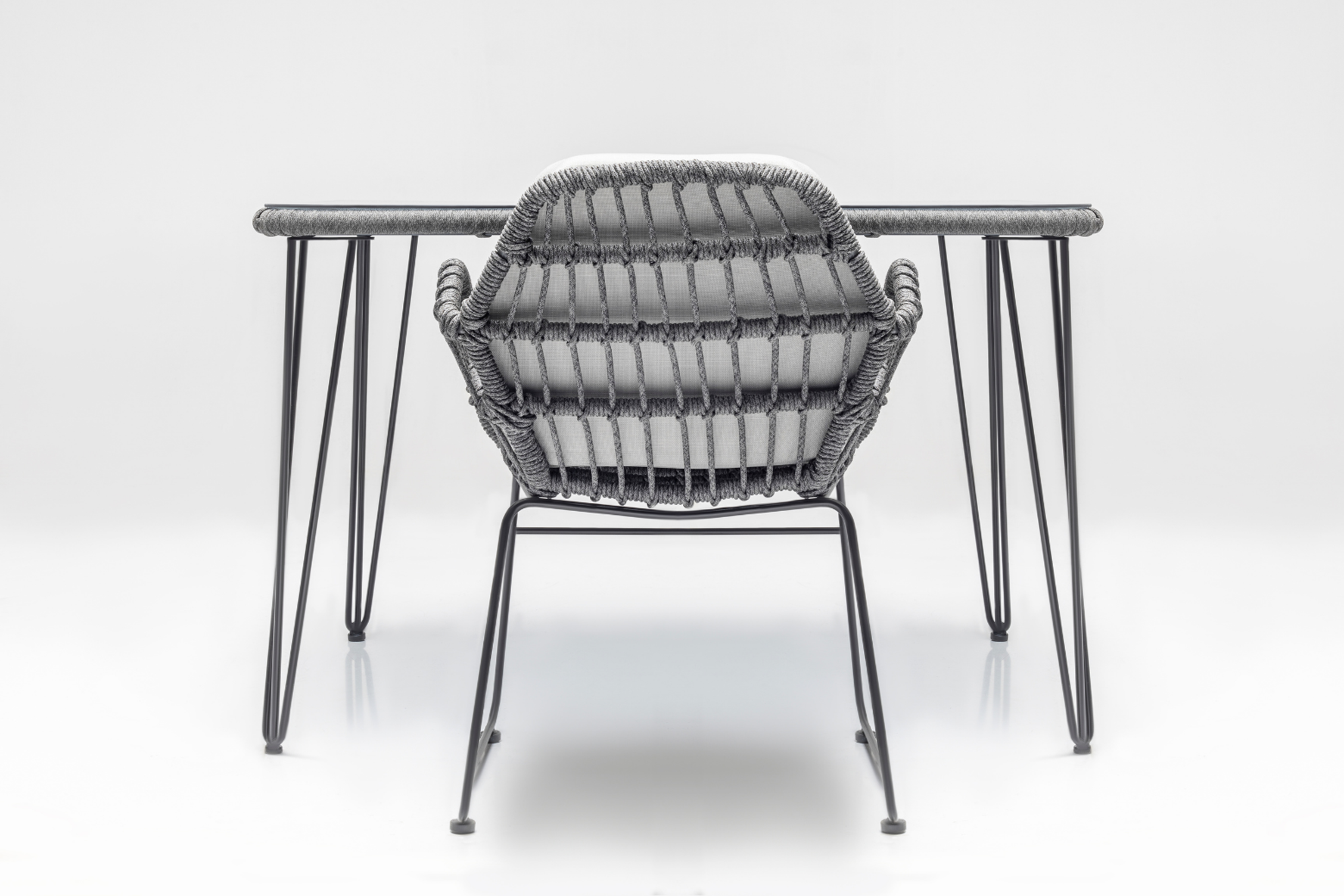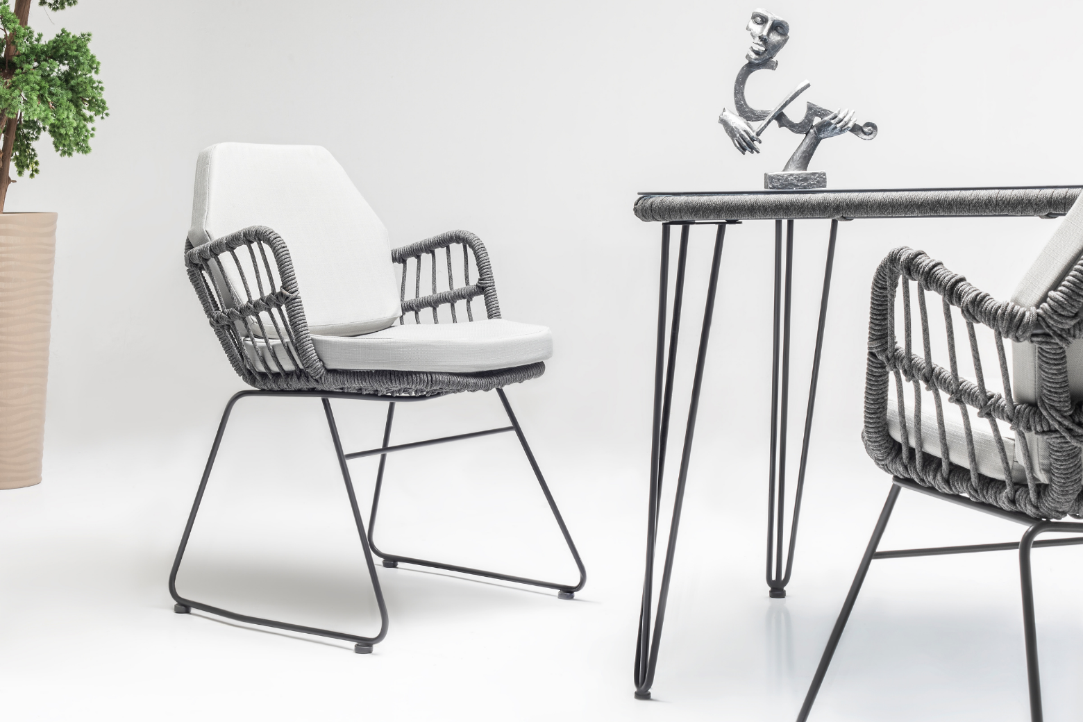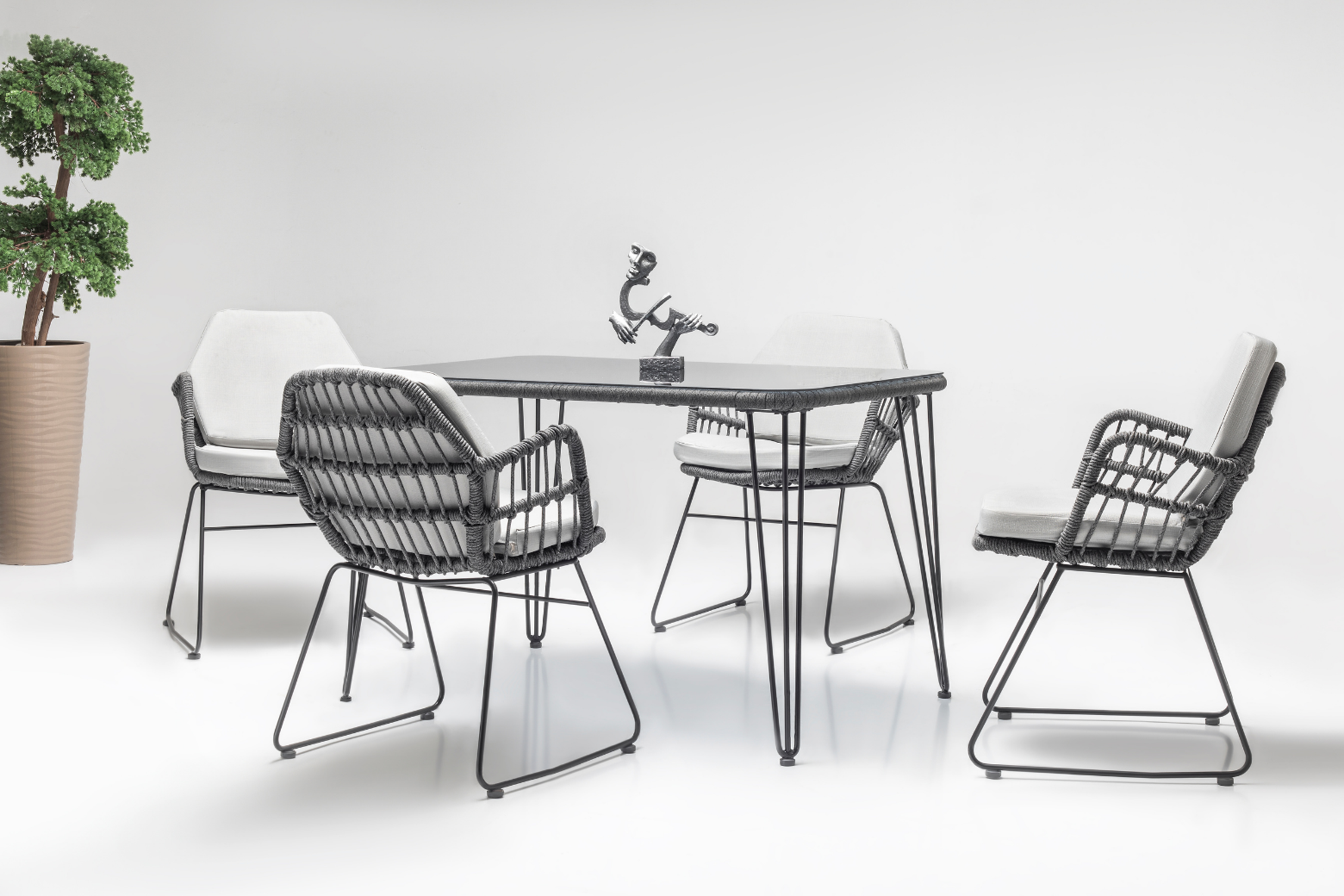 Ninova dining set, which offers a different design to garden furniture with its slim-shaped legs, offers durability and elegance together. The product made of Luxio-Cord Outdoor ropes will add a different atmosphere to your garden. With the pentagonal back design of the table chairs, you can place the Ninova dining set in your spaces according to your taste.