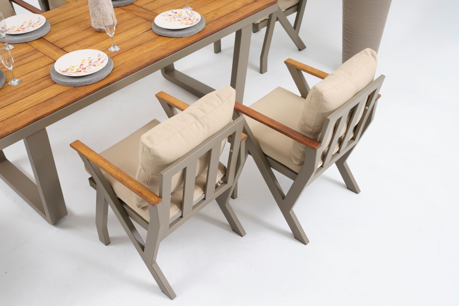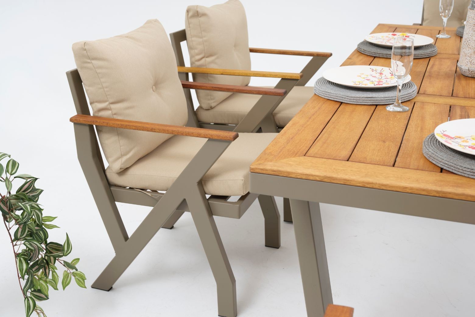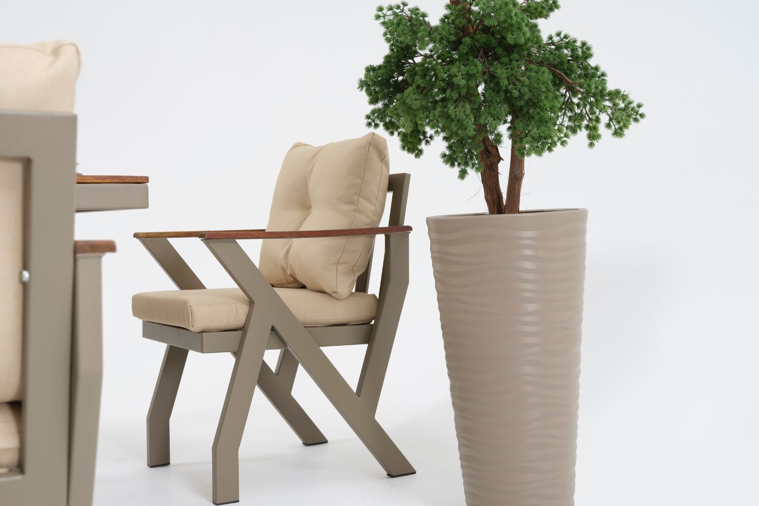 The product is produced from aluminum and painted with electrostatic powder paint. Iroko tree is used in the wooden parts. The cushions used in the product have a density of 32 DNS, and the cushion fabrics are water repellent and stain resistant.