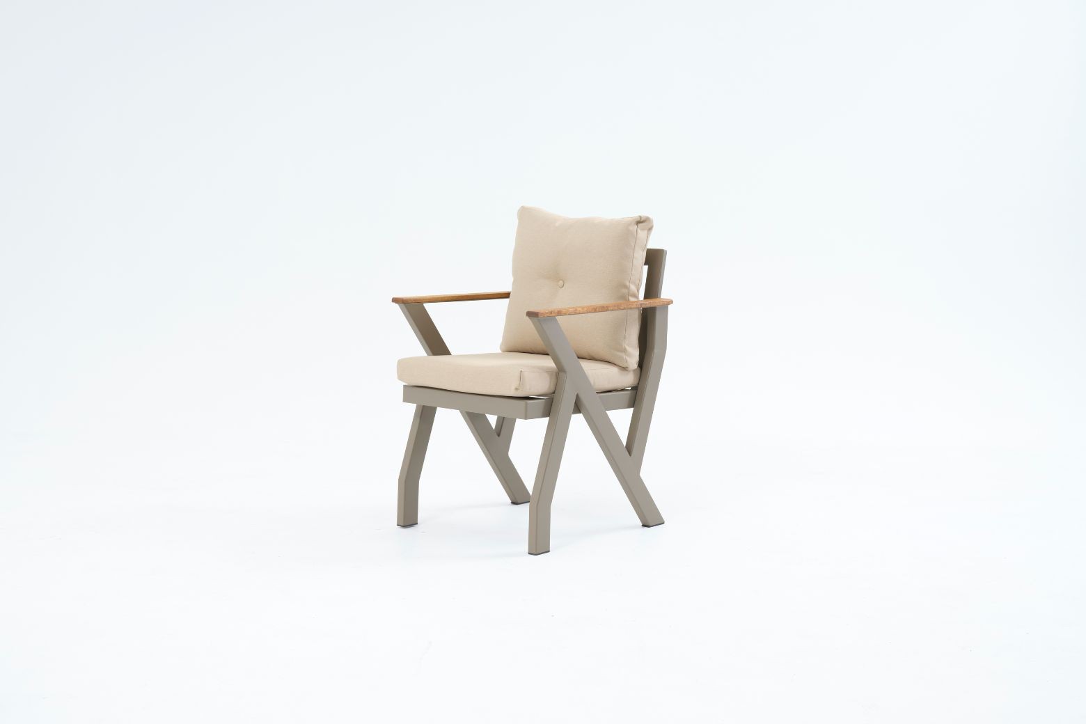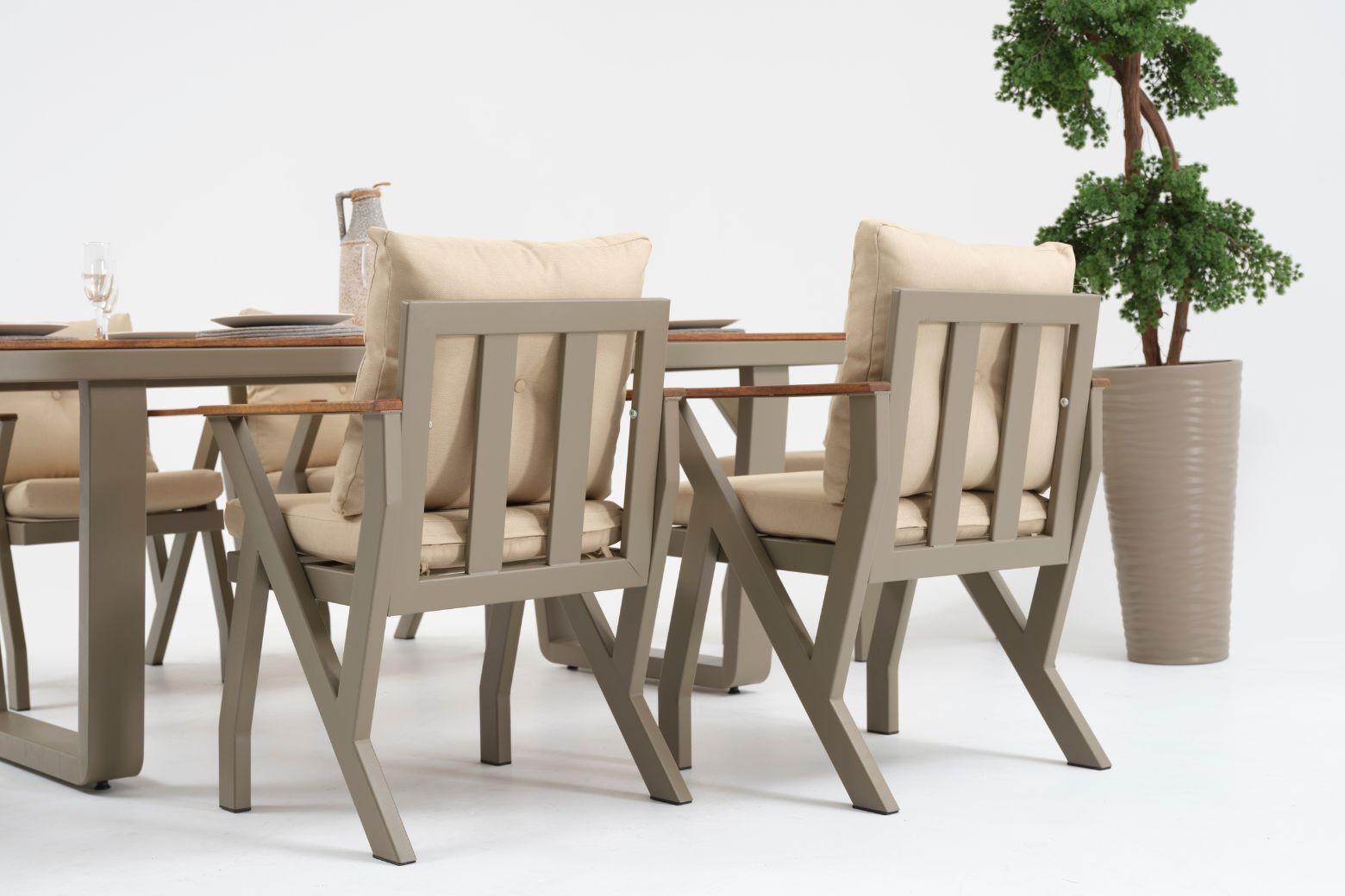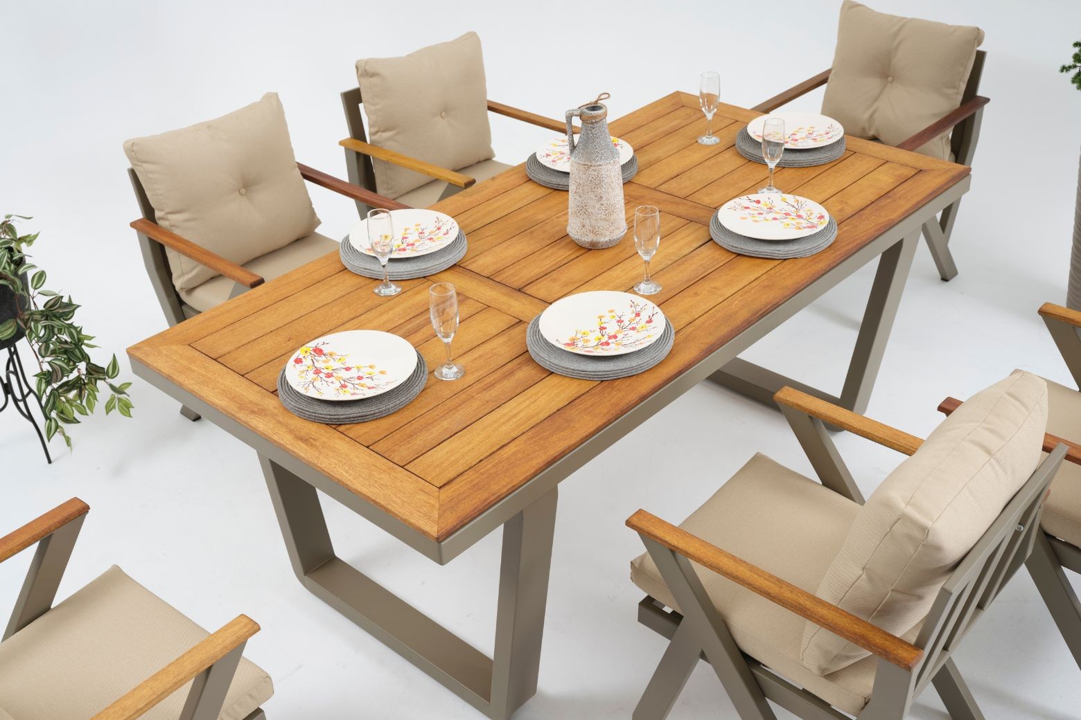 The product is produced from aluminum and painted with electrostatic powder paint. Iroko tree is used in the wooden parts. The cushions used in the product have a density of 32 DNS, and the cushion fabrics are water repellent and stain resistant.